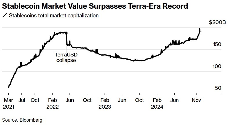 稳定币(Stablecoins)也是一种加密货币,旨在保持价格与法定货币(通常是美元)长期一致。在过去一段时间,它们的主要用途是作为交易员们将资金转入和转出其他加密货币的渠道。但现在越来越多的投资者乐观地认为,随着大力支持加密货币发展的特朗普重返白白宫,稳定币可能将在全球商业以及贸易体系中发挥更重要的作用,特别是作为跨境支付的稳定支付工具。