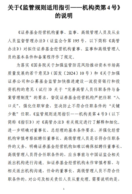 智通财经APP获悉,12月20日,证监会发布《监管规则适用指引——机构类第4号》,为进一步强化证券基金经营机构董事长、总经理的专业胜任能力,拟任董事长、总经理应当从事证券、基金或者金融工作3年以上,且至少1人具备3年以上与拟任职务相关的证券、基金工作经历。该要求适用于本指引发布后拟任董事长、总经理的人员。