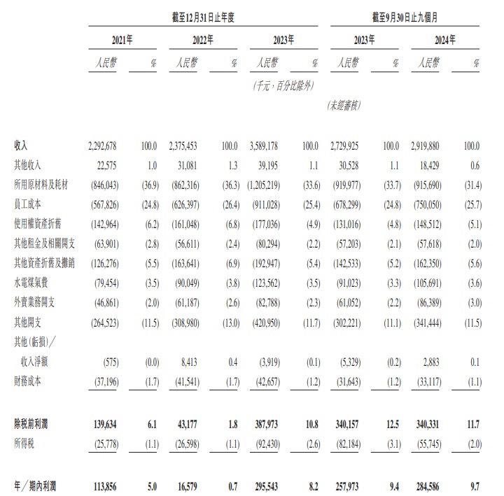 财务方面,于2021年度、2022年度、2023年度、2024年截至9月30日止九个月,绿茶集团收入分别约为人民币22.93亿元、23.75亿元、35.89亿元、29.20亿元;同期,该公司年内利润分别约为1.14亿元、0.17亿元、2.96亿元、2.85亿元。