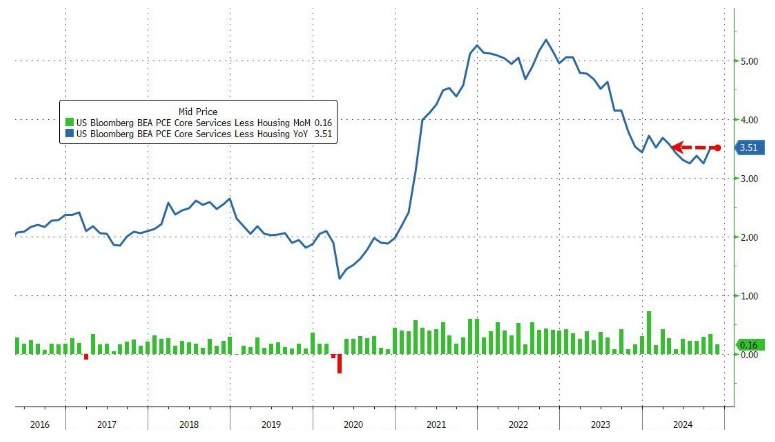 有关价格的细节显示出普遍的减速。核心服务价格环比上涨0.2%,为去年8月以来的最低水平。核心商品价格(不包括食品和能源)三个月来首次下降。所谓的“超级核心服务通胀”(剔除住房通胀)环比上升0.16%,同比上升3.51%(稳定在4月份以来的最高水平)。