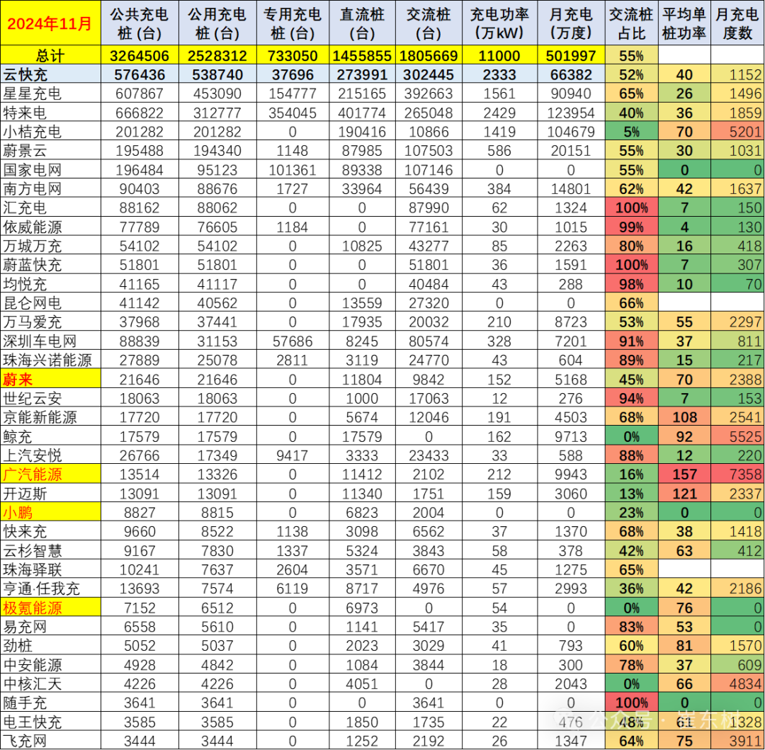 从充电企业运营看,头部的运营商表现较强。广汽能源的充电桩11月平均充电达到7358度,每月都表现很好。蔚来的充电桩充电量达到2388度左右。而部分老旧充电桩的充电平均仅有月均100多度,主力充电企业的月均充电在千度水平,充电电量差距几倍到几十倍的效益差距极其巨大。特斯拉各月数据保持稳定,数据很不错。部分着眼未来新能源汽车特别是电动汽车快速增长的趋势,需要进一步构建高质量充电基础设施体系,更新老旧交流低功率桩,增加高功率直流快充的升级,更好满足人民群众购置和使用新能源汽车需要,助力推进交通运输绿色低碳转型与现代化基础设施体系建设。