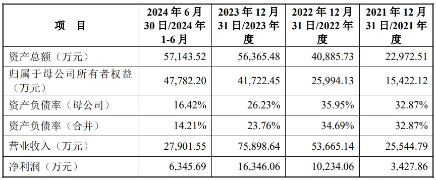 财务方面,于2021年度、2022年度及2023年度,公司实现营业收入分别约为2.55亿元、5.37亿元、7.59亿元。公司净利润分别约为3427.86万元、1.02亿元、1.63亿元人民币。
