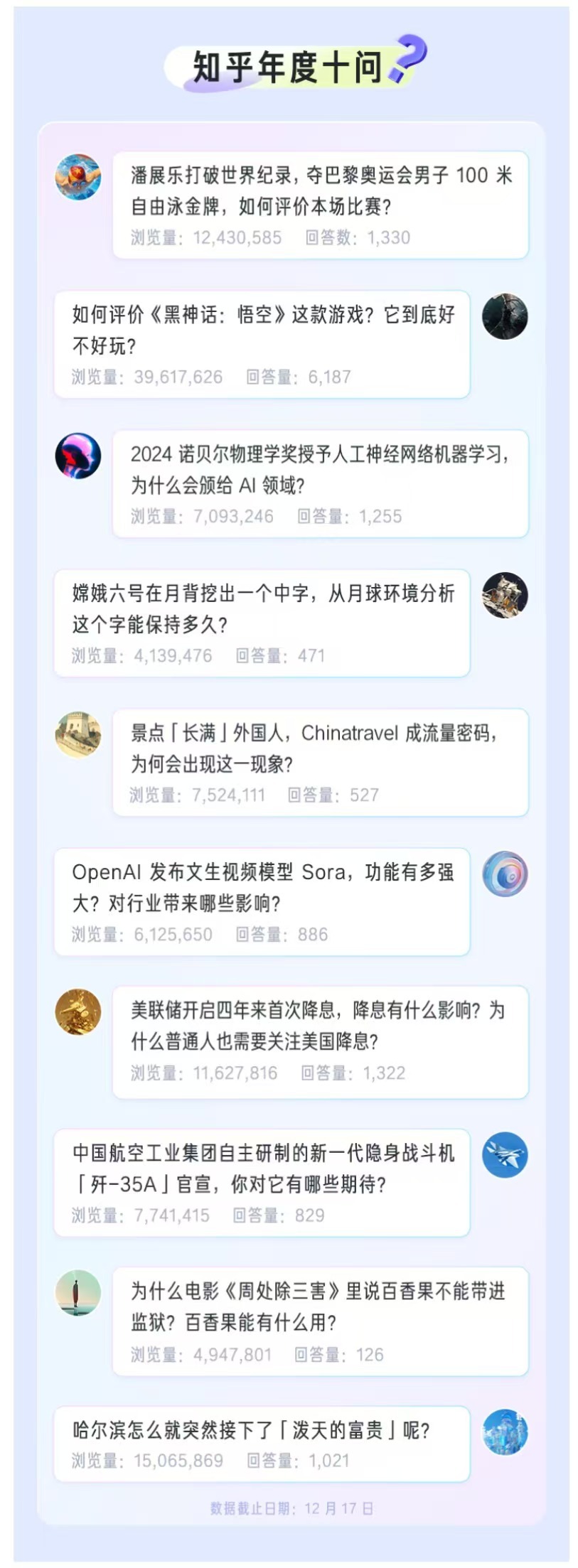 智通财经APP获悉,一个好的问题会引来无数好的回答,它们不仅是好奇心和知识探索的体现,更是时代发展和社会变迁的见证。12月20日,“知乎2024”年度盘点系列活动正式上线,并发布了2024年的“年度十问”,十大问题覆盖人文、体育、科技、社会等多个领域,其中有对现象级游戏《黑神话:悟空》探讨,有对诺贝尔物理学奖授予AI这类科学界新闻的追问,也有对中国新一代隐身战斗机“歼35-A”大国重器的好奇。此外,知乎(02390)同步推出了“我与我看到的世界”圆桌,邀请更多用户分享独特的个人感受,共同书写一份属于2024年的互联网记忆。