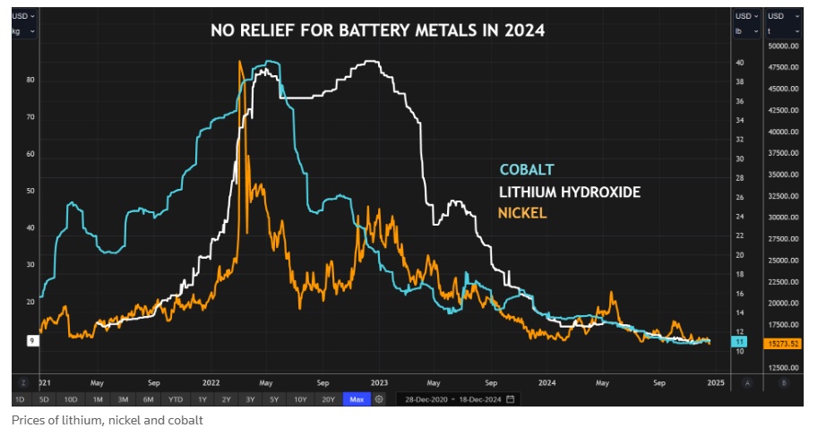 今年对于全球范围的电池金属行业来说,与惨淡的2023年几乎类似,可谓是艰难且残酷的一年。2023年,锂、镍和钴的交易价格全线崩塌,紧接着在2024年上演持续暴跌,这些聚焦于电动汽车的“三大电池金属”的“电动化梦想”显然变成了难以摆脱的“噩梦”。