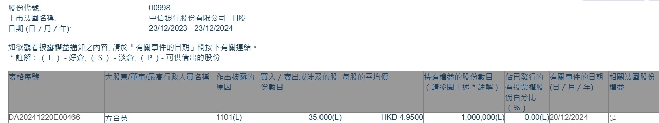 智通财经APP获悉,香港联交所最新资料显示,12月20日,董事长兼执行董事方合英增持中信银行(00998)3.5万股,每股作价4.95港元,总金额约为17.33万港元。增持后最新持股数目为100万股。