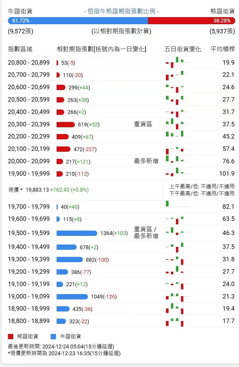 智通财经APP获悉,截至12月24日,恒指最新的牛熊街货比例为62:38。