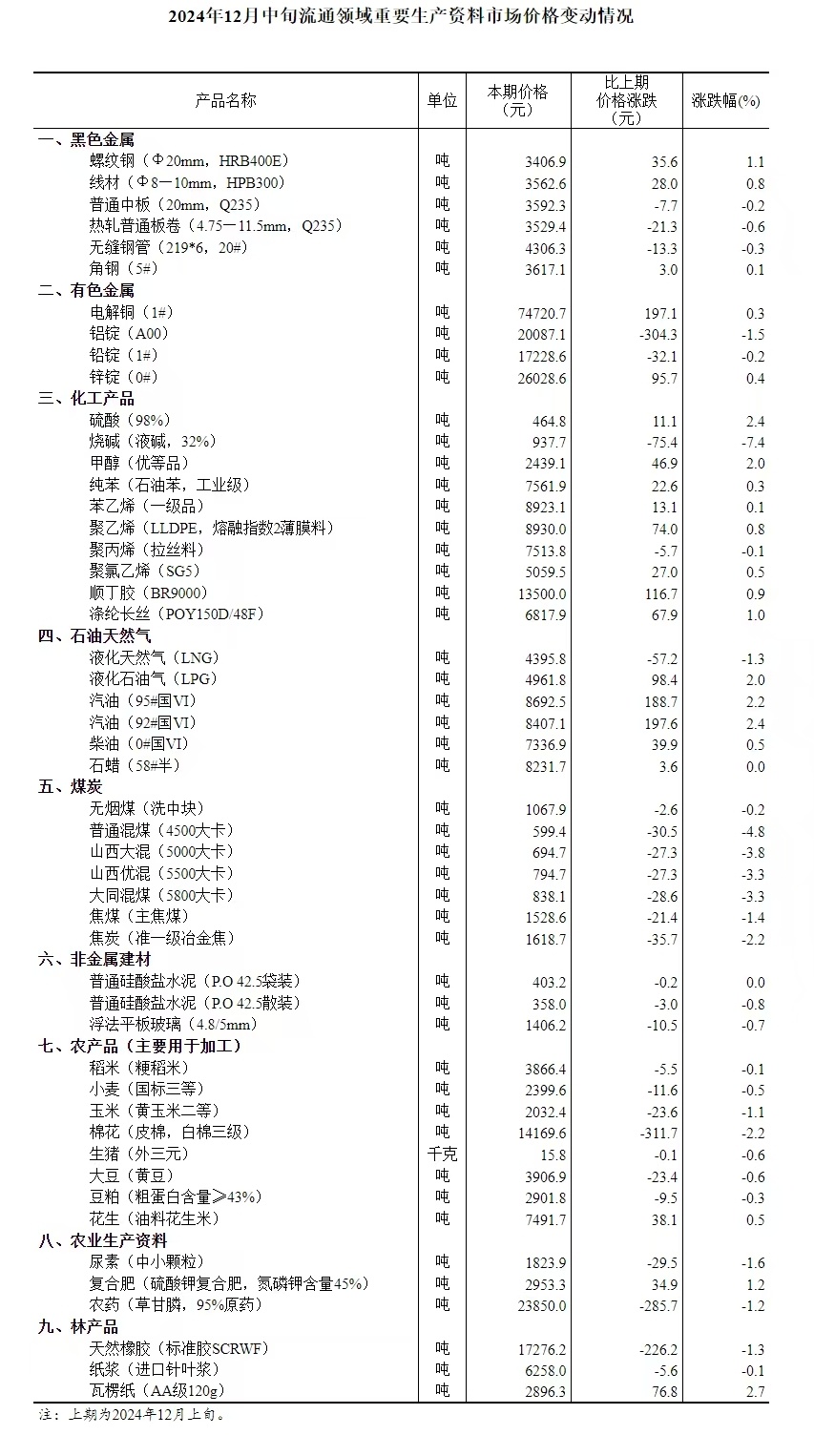 2024年12月中旬流通领域重要生产资料市场价格变动情况