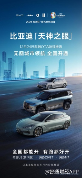2024年12月24日起,比亚迪(01211)高阶智能驾驶辅助系统“天神之眼”在全国范围内正式开通无图城市领航(CNOA)功能,可实现“全国都能开,有路都好开”,不论是城区道路,还是乡间小路,都能为用户带来更安全、更便捷的智能驾驶出行体验。此次无图城市领航功能全国开通,是比亚迪智驾领域的又一突破,标志着比亚迪“天神之眼”高阶智驾能力稳居行业第一梯队。该功能将随具体车型OTA陆续推送。