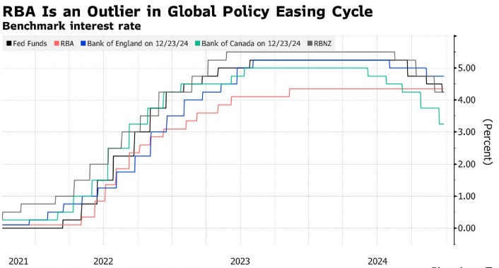 会议纪要让人们关注到澳洲联储主席布洛克(Michele Bullock)出人意料地倾向鸽派的这个月里,该委员会的想法。由于大多数发达国家的经济已经大幅放缓,澳大利亚在当前的经济周期中一直是全球的异类。例如,美联储暗示,在今年已经降息三次的基础上,2025年还将再降息两次。