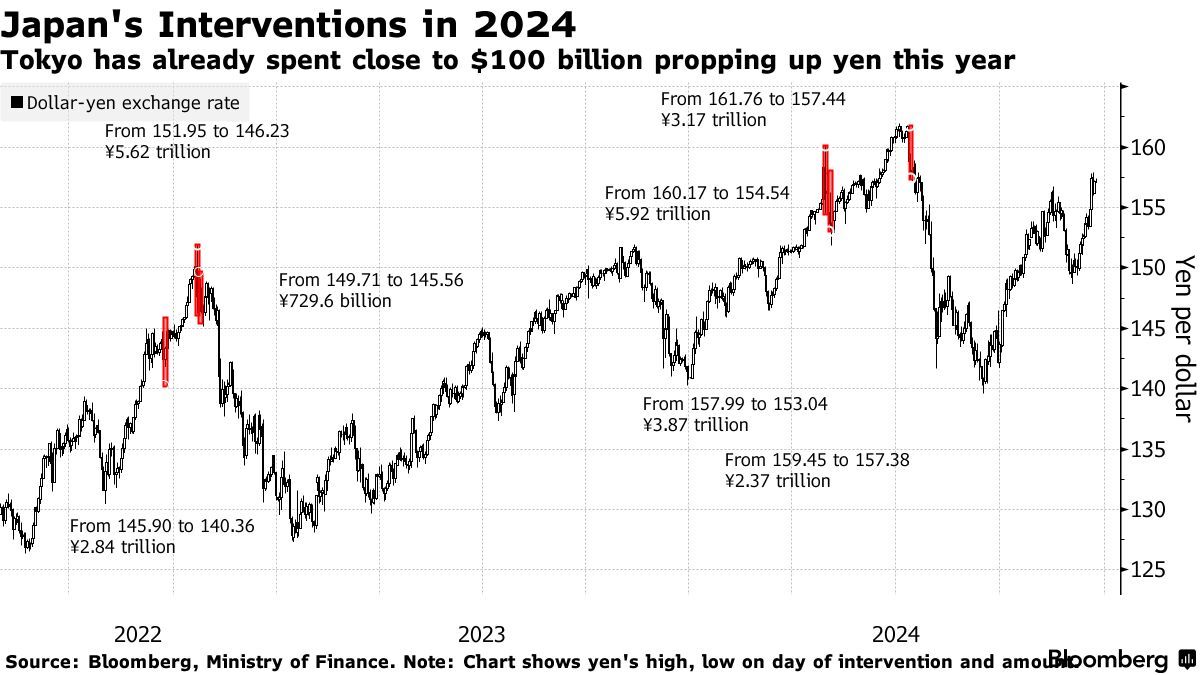 在美元兑日元汇率于7月触及160以后,日本当局一直远离汇市。今年以来,日本当局已经花费了近1000亿美元用于支撑日元。一些分析师认为,美元兑日元汇率在7月触及的161.95关口是日本当局下场干预汇市的潜在门槛。