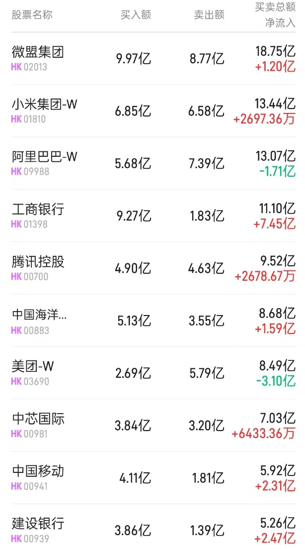 北水净买入最多的个股是工商银行(01398)、中国移动(00941)、小米集团-W(01810)。