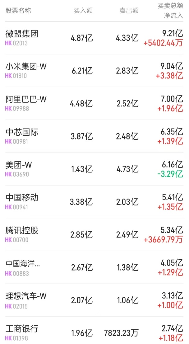 此外,小米集团-W(01810)、理想汽车-W(02015)、阿里巴巴-W(09988)分别获净买入3.65亿、1亿、2504万港元。