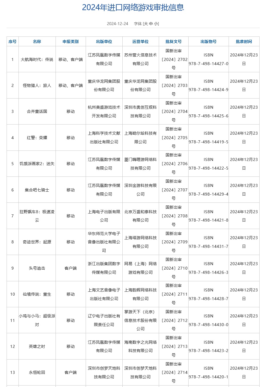 12月进口网络游戏版号下发 共13款游戏获批 创梦天地(01119)、网易(09999)在列