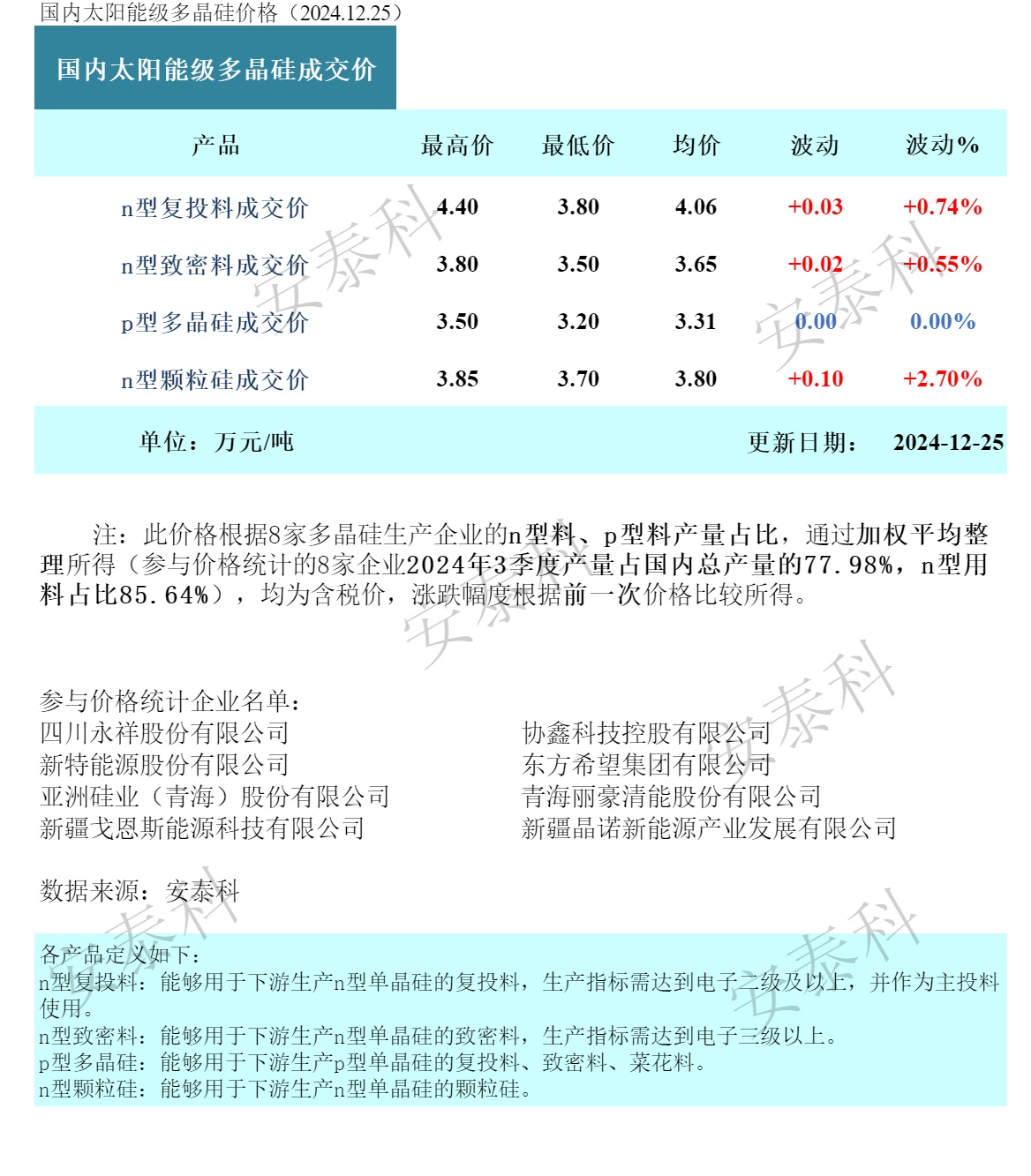 智通财经APP获悉,12月25日,硅业分会发文称,本周多晶硅成交价格小幅上涨,部分多晶硅头部企业发布检修减产公告,正式进入低负荷运转阶段。受制于多晶硅供需关系短期无法扭转,下游直采大单价格未出现明显变动。而现阶段新签单多以小单或贸易商订单为主,这部分订单价格出现一定幅度上涨,主要原因是,受多晶硅期货上市及全部在产企业降负荷运行等利好因素影响,上下游企业均对硅料价格后续走势持乐观态度,故阶段性在成交量和成交价格方面较快达成了共识,因此短期内多晶硅价格呈现小幅上调走势。