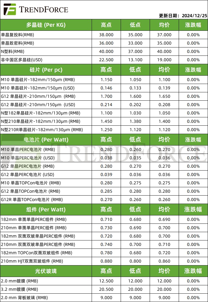 183N、210N型供需维持紧俏,供给端即将进入2025年1月,自律公约实施日期,预计对产出约束力度增强,而需求则新增下游看涨心态加强的变量,供需边际好转,故价格上涨动能增强;部分厂商反馈已在1月对各尺寸规格硅片报涨,后续仍观察客户的实际接受程度。