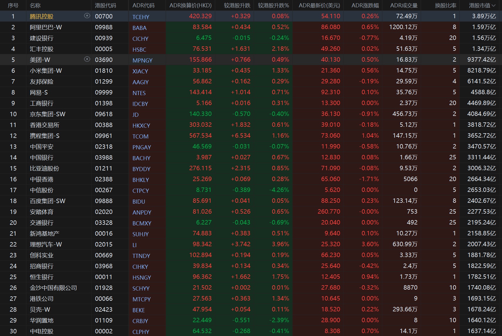 大型蓝筹股多数上涨,汇丰控股收报76.531港元,较香港收市涨2.18%;腾讯控股收报420.329港元,较香港收市涨0.08%。