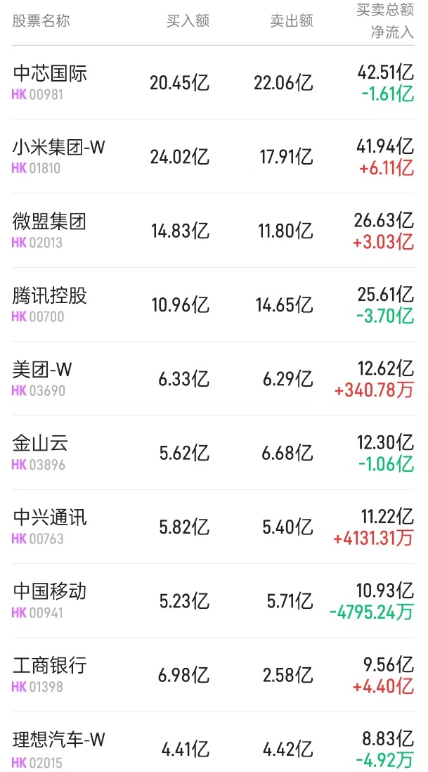 此外,小米集团-W(01810)获净买入7.55亿港元,而中兴通讯(00763)、中国移动(00941)分别遭净卖出4795万港元。