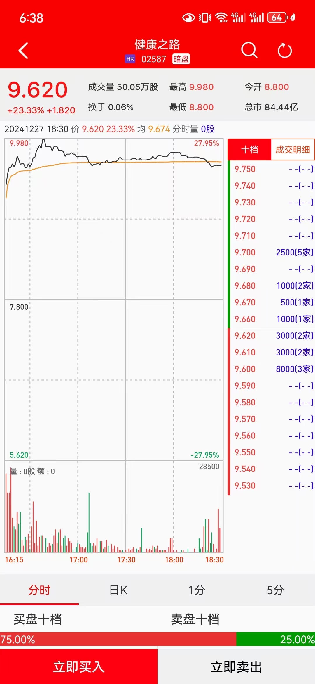 智通财经APP获悉,健康之路(02587)将于12月30日(周一)在香港挂牌。截至收盘,利弗莫尔证券暗盘交易显示报价9.62港元,较招股价7.8港元上涨23.33%,每手500股,不计手续费,每手赚910港元。