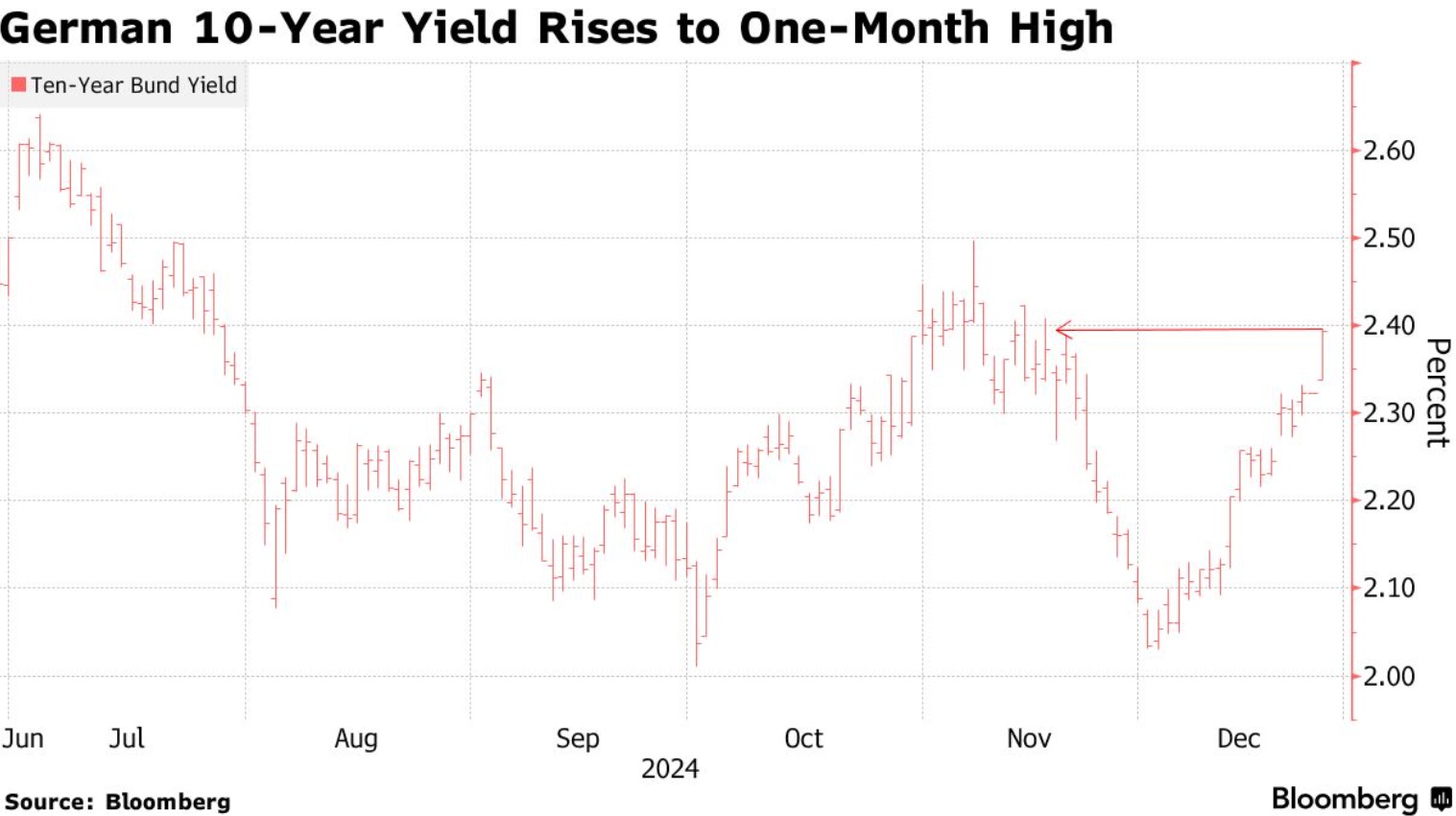 自12月初以来,10年期德国国债的收益率已经上升了约30个基点,有望创下自2023年9月以来的最大月度涨幅。这一重新定价现象发生的同时,交易员们减少了对欧洲央行降息的押注,原因是美联储在12月初的表态比预期更为鹰派,暗示在放松政策方面将更加谨慎。