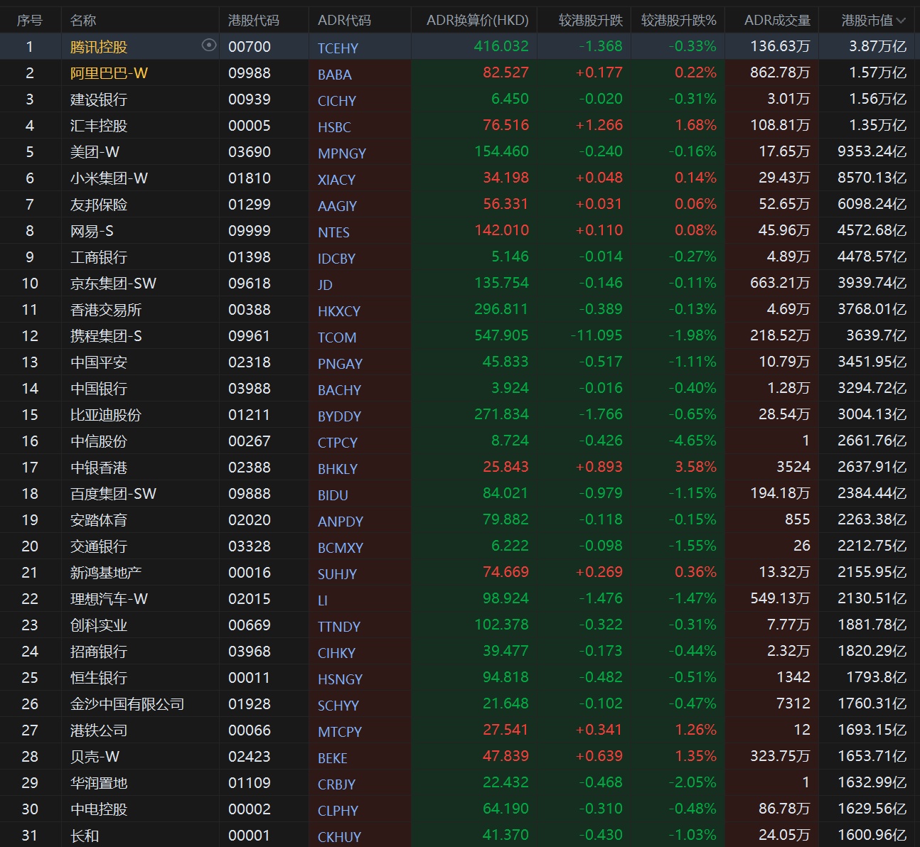 智通财经APP获悉,周五美股三大指数集体收跌,恒生指数ADR下跌,按比例计算,收报20067.35点,较香港收市下跌23.11点或0.12%。