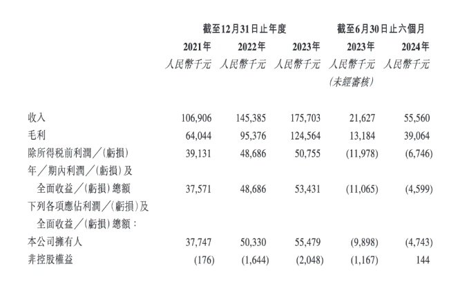 就业绩表现来看,随着在自动驾驶行业深耕,赛目科技的营收逐步增长。2021年-2024年上半年(以下简称:报告期内),赛目科技实现收入分别约1.07亿元(单位:人民币,下同)、1.45亿元、1.76亿元及0.56亿元;同期年内利润及全面收益总额分别为约3757.1万元、4868.6万元、5343.1万元及-459.9万元。
