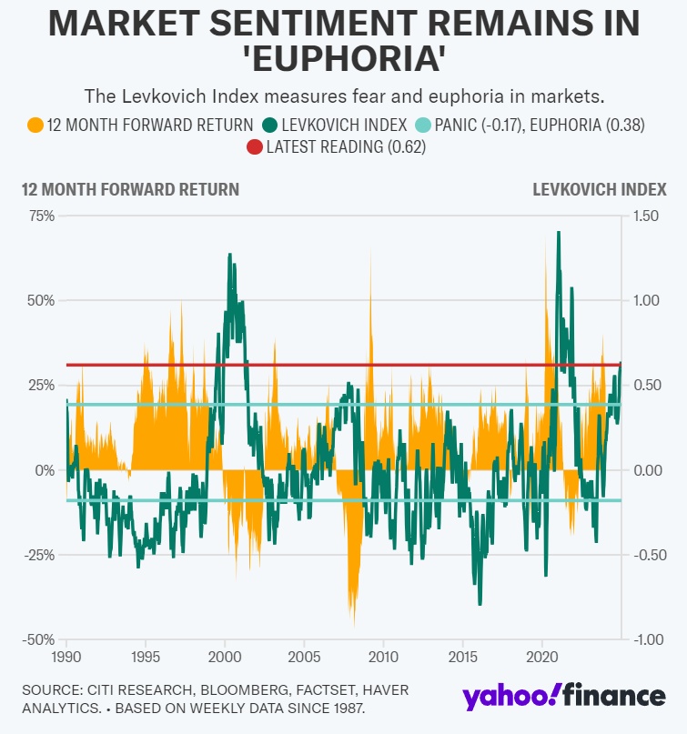 这推动了以花旗Levkovich指数衡量的市场情绪日益高涨。Levkovich指数考虑了投资者的空头头寸和杠杆率等因素,以确定市场情绪,该指数目前为0.62,高于0.38的乐观线。在乐观线上,由于市场似乎处于紧张状态,远期回报为正的可能性通常较低。