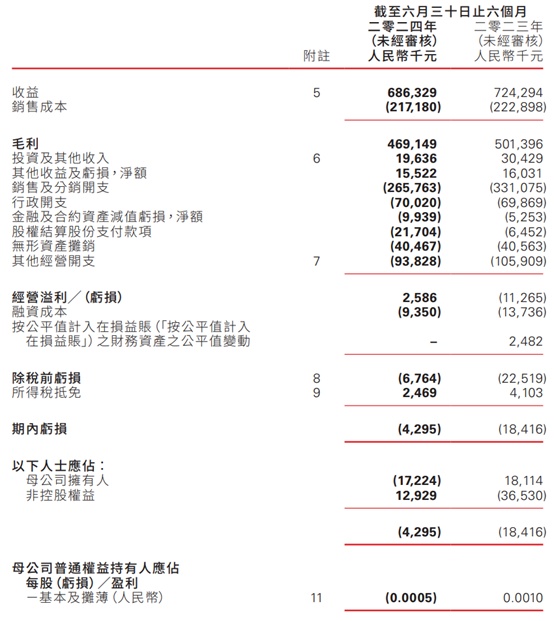 具体而言,在截至2024年6月30日止的6个月中,公司取得收益约6.86亿元(人民币,下同),同比减少5.2%;母公司拥有人应占亏损1722.4万元,相比去年同期的利润1811.4万元有明显下滑。公司方面称,收益减少乃主要由于订阅解决方案收益减少,部分已由商家解决方案收益增加所抵销。