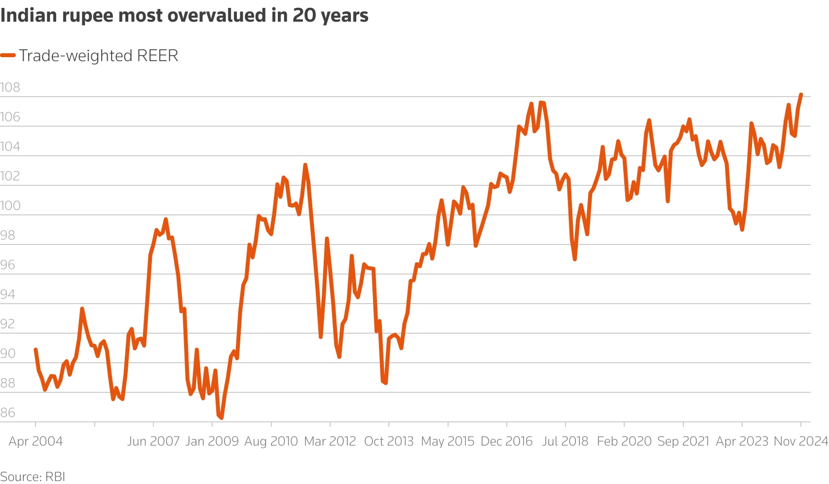 智通财经APP获悉,经济学家表示,印度央行将需要重新考虑其外汇策略,并在2025年放松对印度卢比的控制,因为按贸易加权计算,卢比对其他货币的汇率处于至少20年来的最强水平。