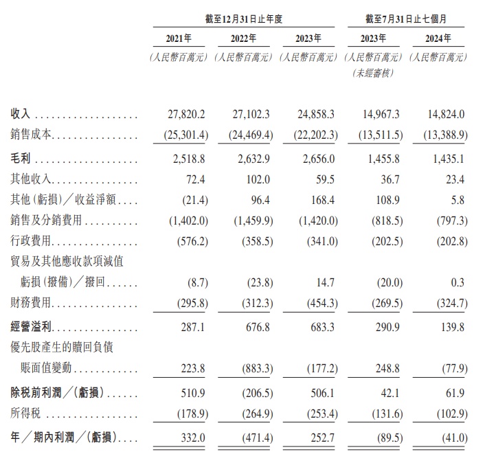 财务方面,于2021年度、2022年度、2023年度以及2024年截止7月31日止七个月,公司的收入分别约为人民币278.20亿元、271.02亿元、248.58亿元以及148.24亿元;同期,公司的年内利润分别约为人民币3.32亿元、-4.71亿元、2.53亿元以及-0.41亿元。