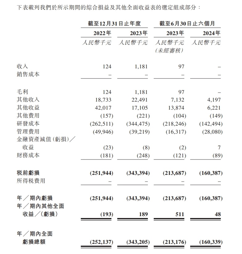 财务数据显示,于2022年、2023年以及2024年1-6月,药捷安康收入分别约为12.4万元、118.1万元、0元人民币,相应期间年内亏损分别约为2.52亿元、3.43亿元、1.6亿元人民币。