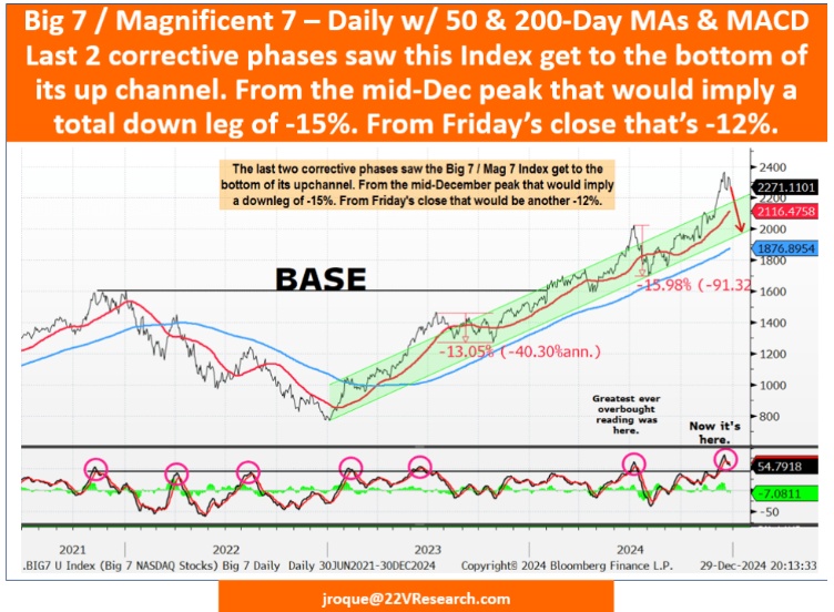 22V Research的股票技术策略主管约翰•罗克表示:“七大科技巨头从其向上倾斜的价格通道的边界上方跌至该价格通道的下边界的最近两个调整阶段,跌幅分别为-13%和-16%。现在类似的修正阶段,意味着按照当前的技术形态,聚焦于七大科技巨头的ETF——Roundhill Magnificent Seven距离上周五收盘价位还有-12%左右调整幅度。”