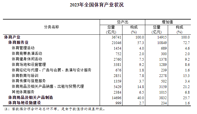 智通财经APP获悉,国家统计局发布的公告显示,根据第五次全国经济普查结果,经核算,2023年全国体育产业总规模(总产出)为36741亿元,增加值为14915亿元,占国内生产总值(GDP)的比重为1.15%,比上年提高0.07个百分点。