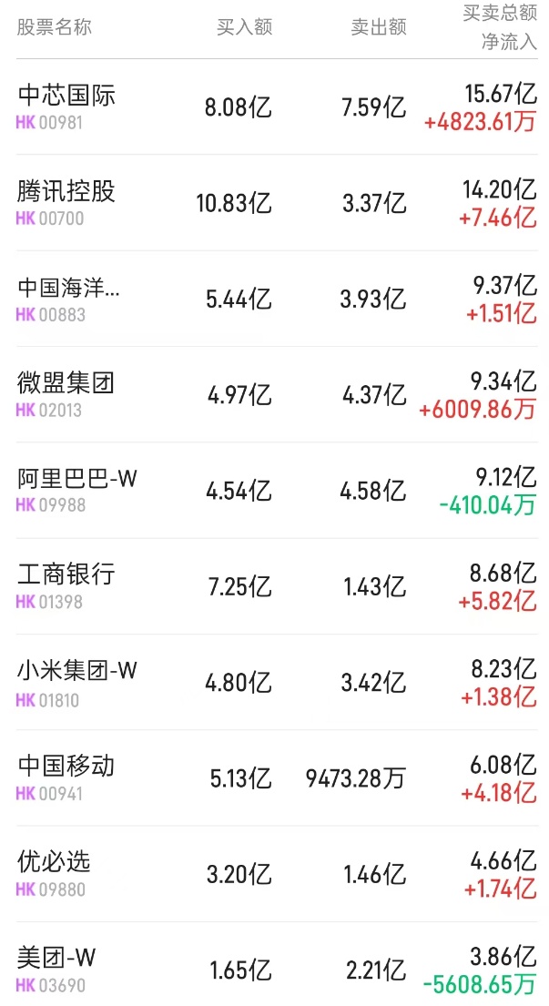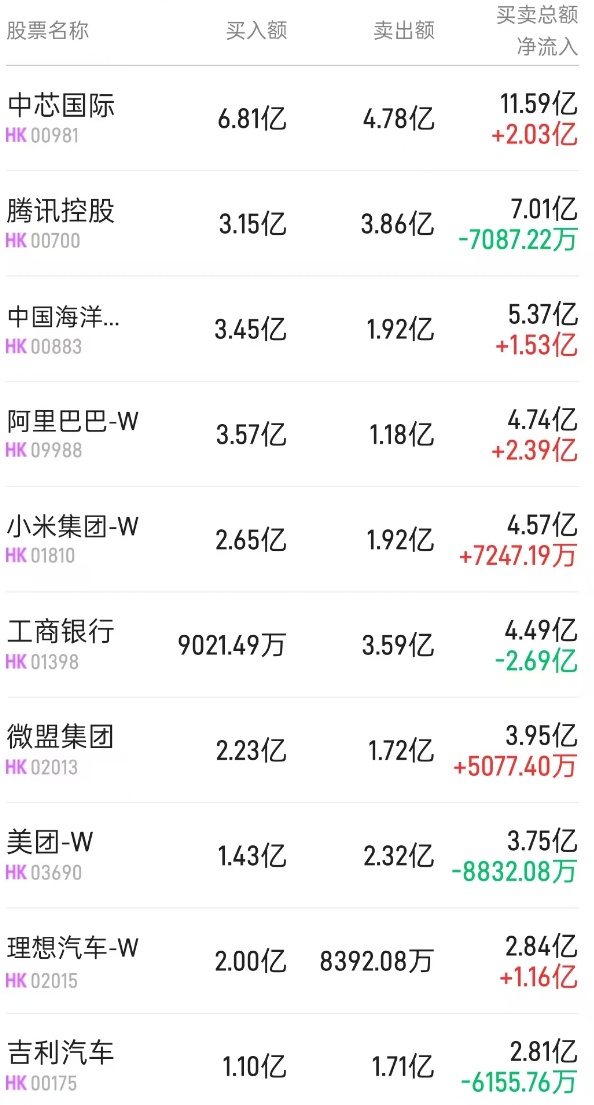 中芯国际(00981)获净买入2.51亿港元。消息面上,平安证券发布研报称,当前消费电子有所回暖,半导体国产化进程持续推进,此外,AI带来的算力产业链也将持续受益,半导体行业当前已处于复苏阶段,消费电子回暖,将推动半导体新一轮上升周期,看好行情复苏及AI算力产业链两条主线。华鑫证券指出,中芯国际作为中国大陆集成电路制造业领导者和世界领先的集成电路晶圆代工企业之一,稀缺性和重要性不言而喻。