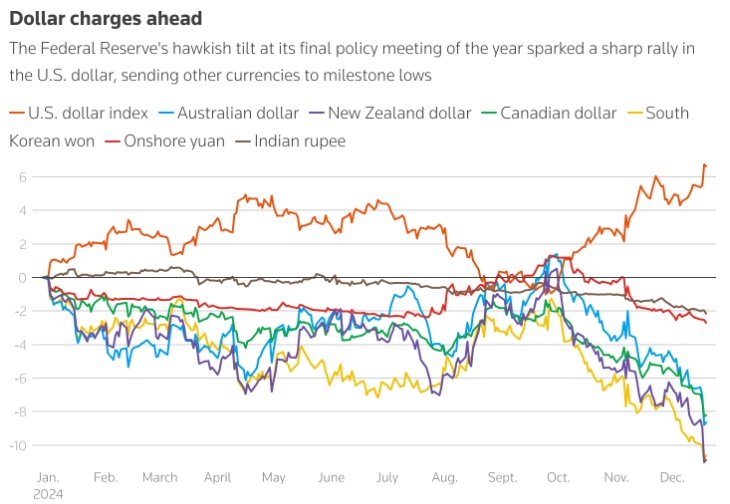 全球股市上涨在很大程度上要归功于美国股市连续第二年大幅上涨,人工智能热潮和强劲的经济增长吸引了更多的全球资本进入美国资产,推动美元兑其他货币在2024年上涨了6.6%。在特朗普于11月5日赢得大选后,美国的繁荣情绪上升,因为交易员们关注的是这位当选总统的减税和放松管制计划,动物精神的飙升推动加密货币比特币的年涨幅达到122%。