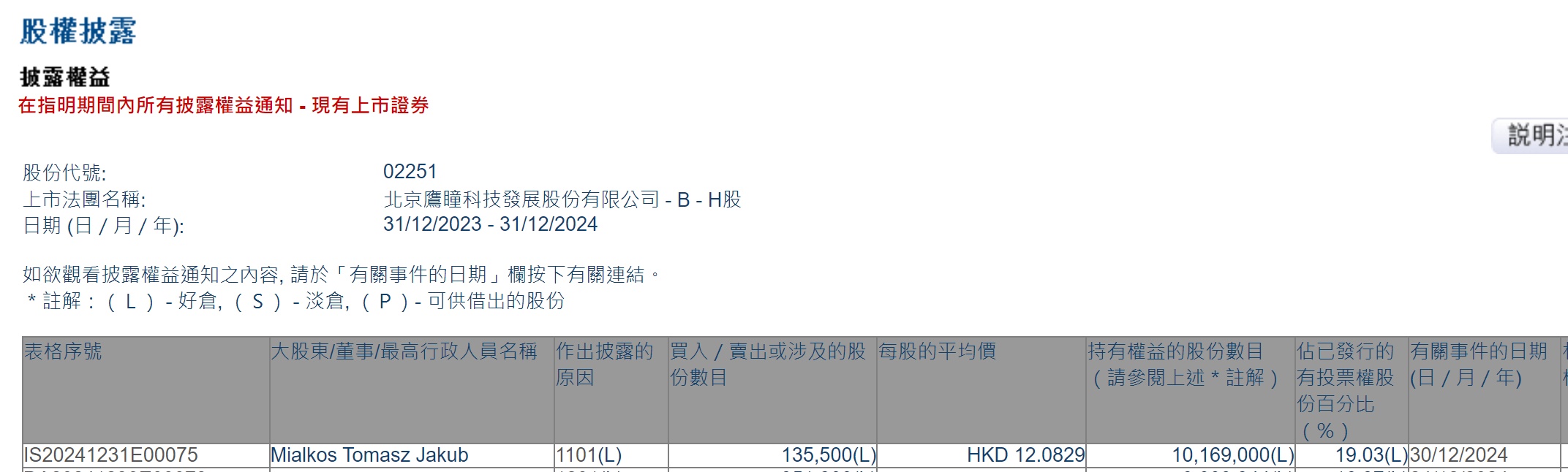 Jakub增持鹰瞳科技-B(02251)13.55万股,平均每股作价为12.0829港元,总金额约为163.72万港元。增持后最新持股数目为1016.9万股,最新持股比例为19.03%。
