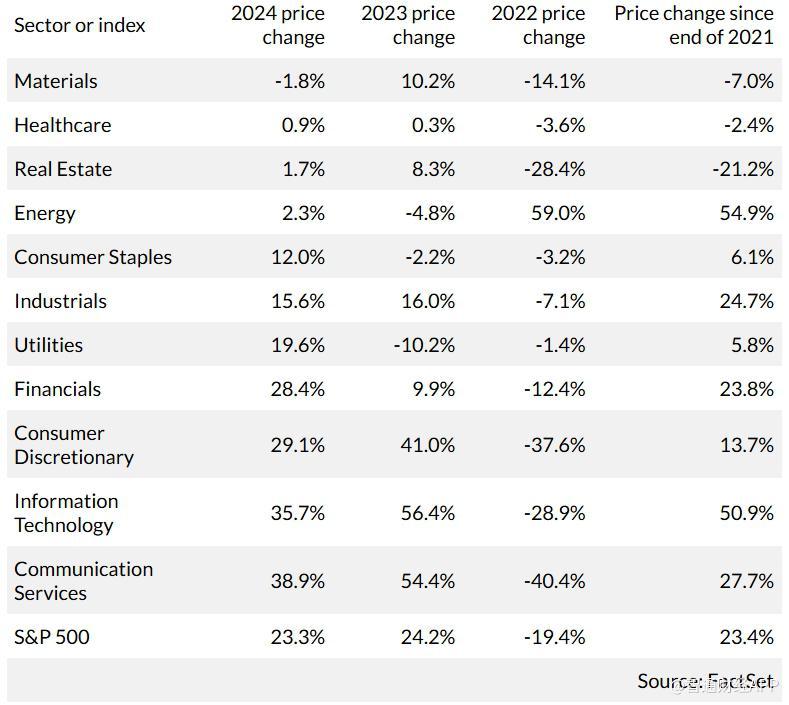 智通财经APP获悉,截至2024年12月30日,标普500指数连续两年上涨,2024年上涨23.3%,2023年上涨24.2%。然而,自2021年底以来的累计涨幅仅为23.4%,因为2022年曾下跌19.4%。