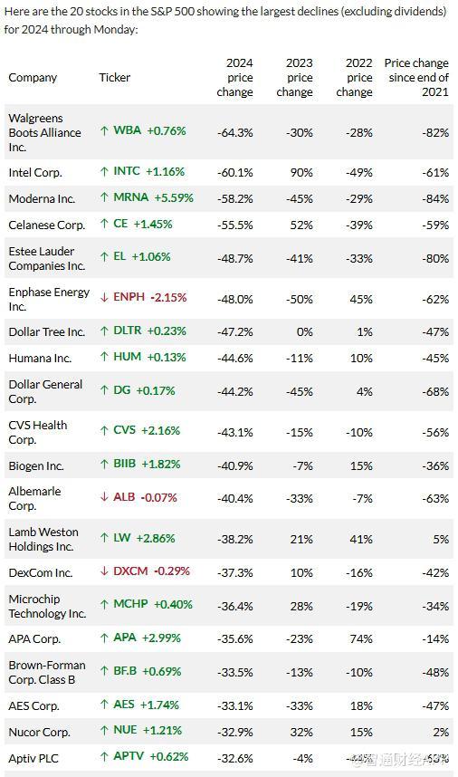 在这些下跌的股票中,Walgreens Boots Alliance(WBA.US)和英特尔(INTC.US)领跌。Walgreens的股价在2024年下跌了约64%,主要原因是公司业绩未达预期,以及面临激烈的市场竞争和行业挑战。英特尔的股价也下跌了约60%,这与其在半导体行业中面临的激烈竞争和市场份额的下降有关。