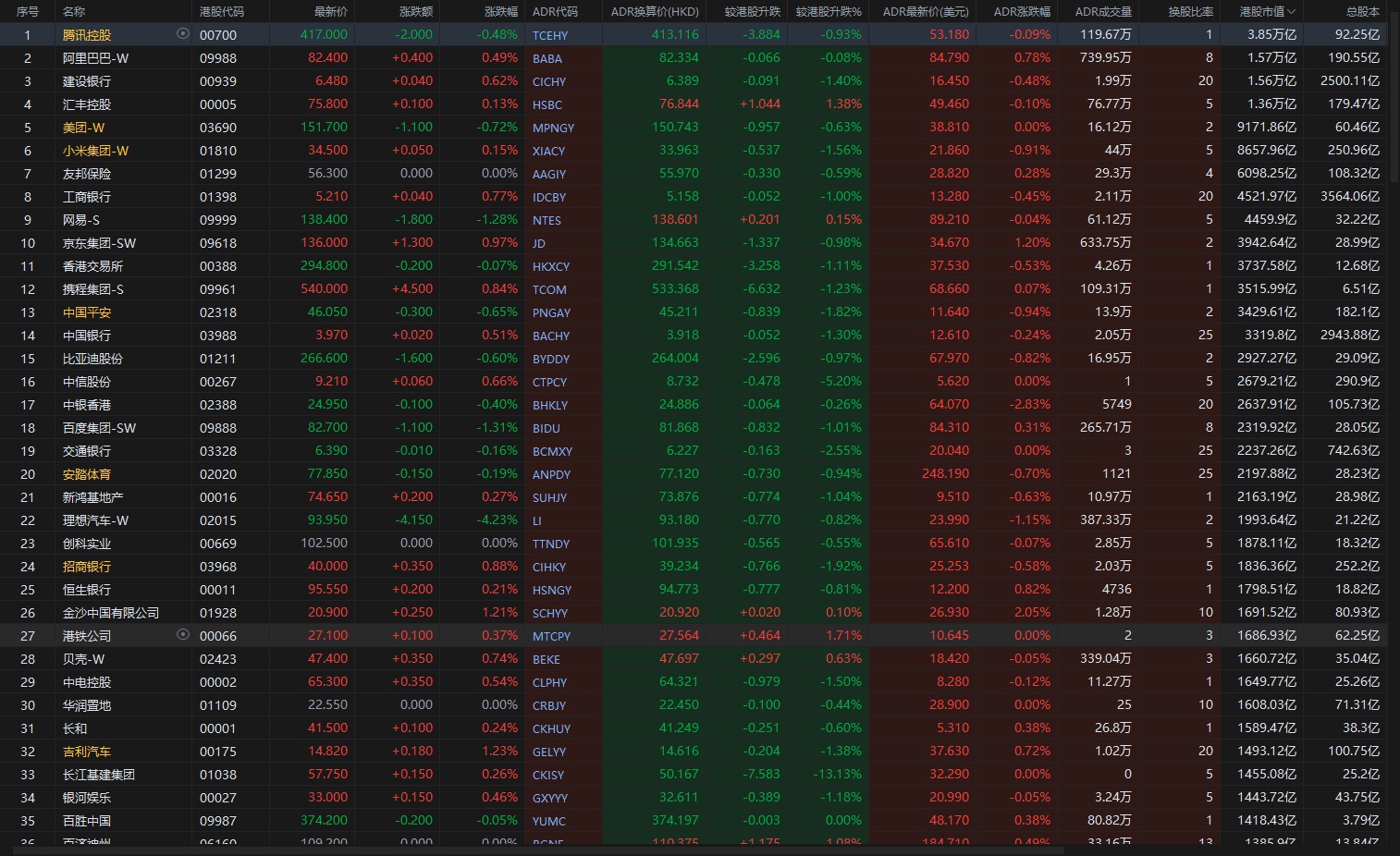 大型蓝筹股多数下跌,汇丰控股收报76.844港元,较香港收市涨1.38%;腾讯控股收报413.116港元,较香港收市跌0.93%。