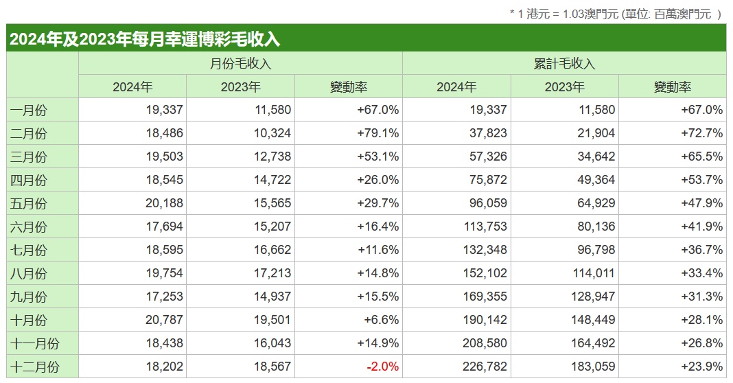 智通财经APP获悉,根据澳门博彩监察协调局数据显示,澳门2024年12月份幸运博彩毛收入共计182.02亿澳门元,同比下降2%。2024年1-12月,澳门幸运博彩毛收入累计2267.82亿澳门元,同比增长23.9%。