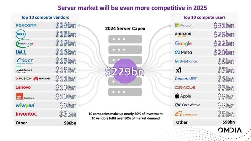 2024年,由于投资的高度集中,这一年对于服务器市场而言格外独特。Omdia预测,前10家用户公司就几乎占据了全球服务器采购额的60%,前十家服务器厂商则满足了超过70%的市场需求。