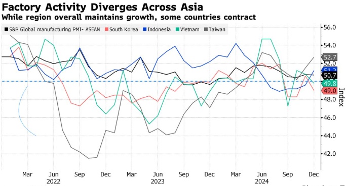 最新的数据是在本月晚些时候美国当选总统特朗普宣誓就职之前发布的,特朗普发誓要对中国征收高额关税,并对进口商品征收普遍关税。东南亚制造业数据突显出对海外贸易保护主义和未来国内需求的担忧日益加剧。