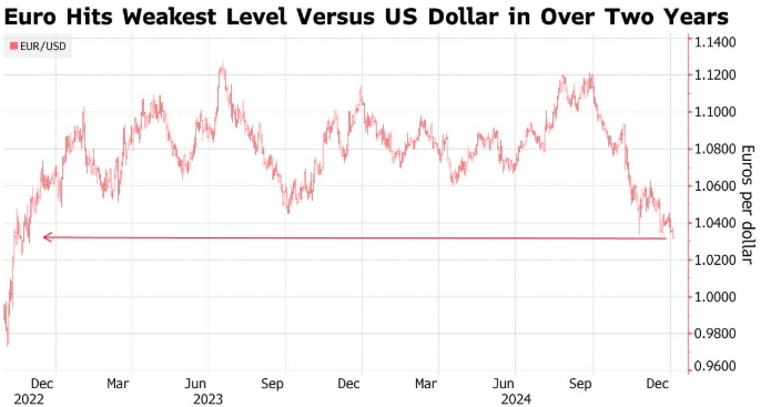 由于担心该地区出口导向型经济体将受到美国贸易关税的打击,以及欧洲央行降息幅度将超过美联储的预期,欧元汇率一直走低。欧元区最大经济体德国与法国的政治不稳定也增加了欧元的压力。
