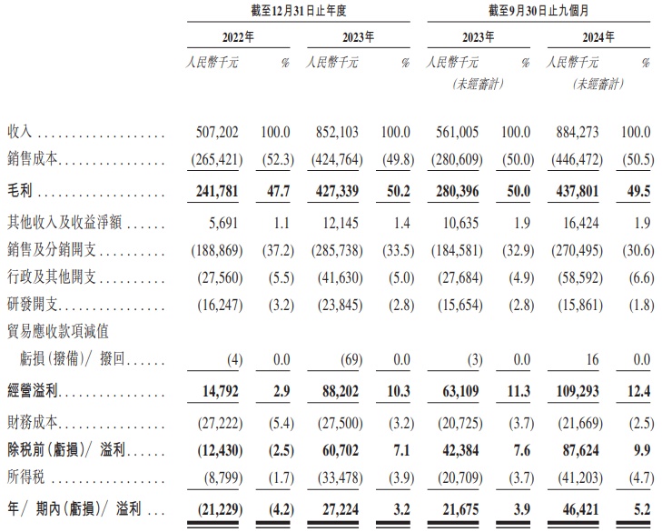 财务方面,于2022年、2023年及2024年截至9月30日止九个月,不同集团收入分别约为5.07亿元、8.52亿元、8.84亿元人民币;同期,年内溢利分别为-2122.9万元、2722.4万元、4642.1万元人民币。