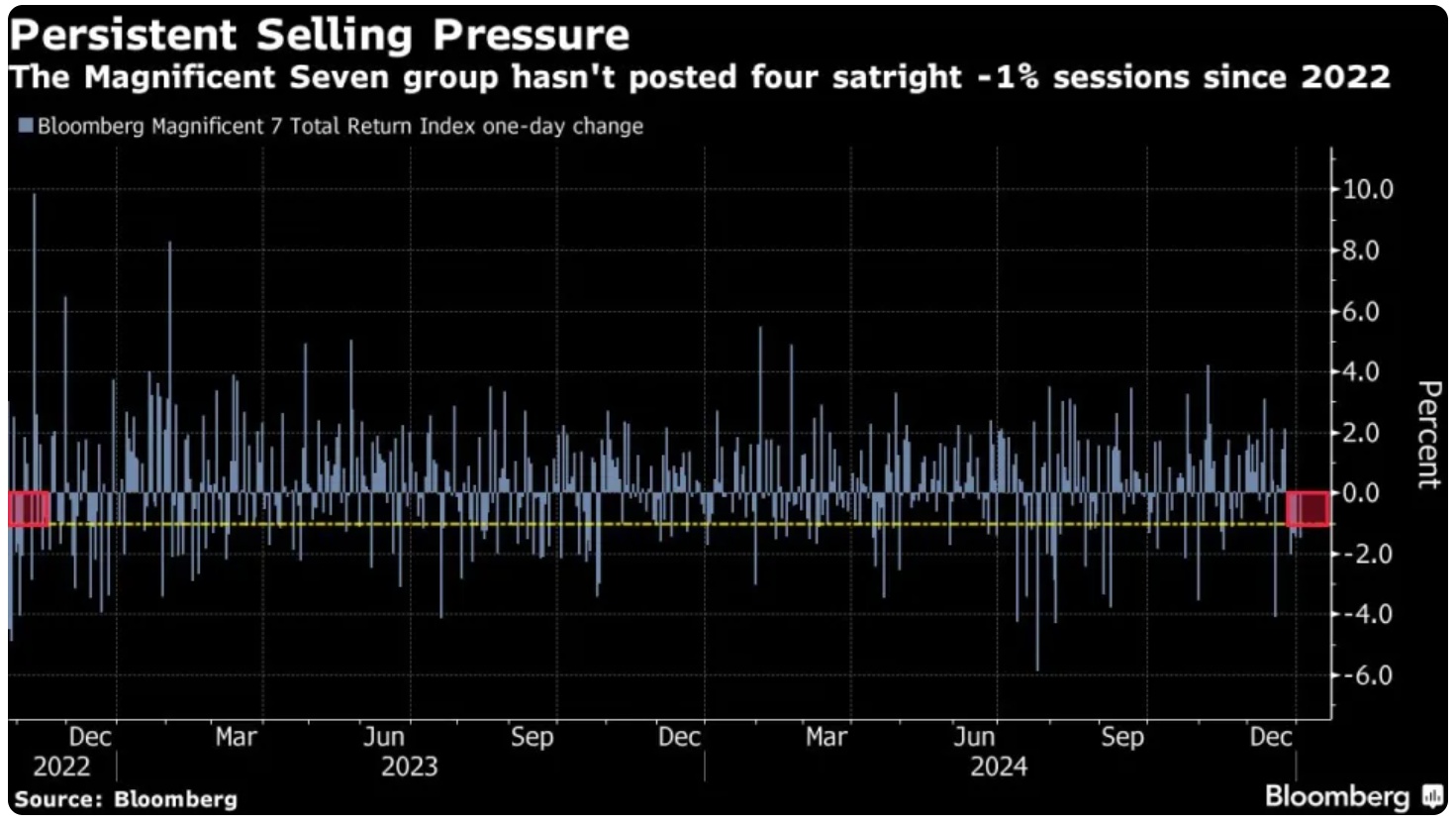 这或许可以解释为什么投资者对该股越来越谨慎。彭博七大科技股全回报指数有望连续第四个交易日下跌至少 1%,这是自 2022 年以来最长的下跌周期。该指数从未出现连续五天下跌 1% 或以上的现象。