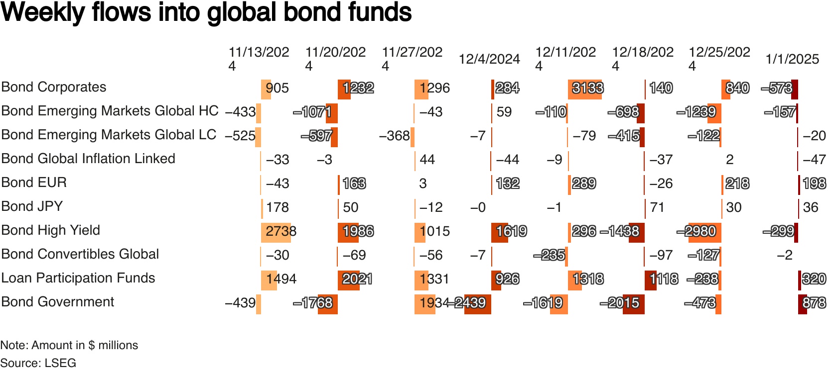 MSCI全球指数在2024年累计上涨了15%以上,但在截至1月1日的一周内下跌了1.5%,原因是投资者在去年股市大涨后选择获利了结。与此同时,美债收益率的上升也抑制了投资者对股票的兴趣。数据显示,十年期美债收益率在上周升至4.641%,为2024年5月2日以来的最高水平。