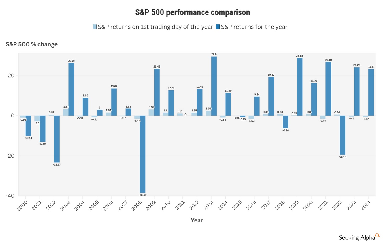数据显示,自21世纪以来,标普500指数在一年首个交易日的回报率有13次与年度最终表现相符,有12次与年度最终表现不同。值得注意的是,在过去四年中,标普500指数在年内首个交易日的表现与年度最终表现一直存在差异。