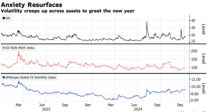 新年伊始,华尔街整体情绪是不安的。尽管周五市场情绪有所回升,但各资产类别的交易员在假期后的大部分时间里都在抑制强劲的风险偏好,这种偏好在2024年的大部分时间里一直主导着市场。美国国债和企业信贷的波动性指标悄悄上升。股市波动指标跳升,此前出现了有记录以来最严重的年末跌幅。追踪比特币的最大交易所交易基金(ETF)出现了有史以来最严重的资金流出,该基金是全球投机者的宠儿。
