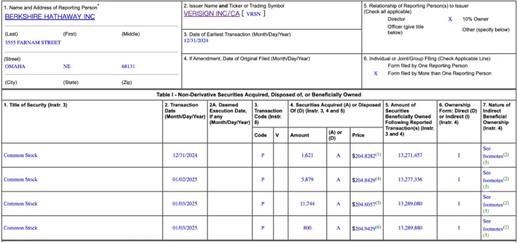 资料显示,早在2013年,伯克希尔就首次购买了这只科技股,多年来持股比例一直保持稳定。直至2024年12月19日披露的监管文件显示,在去年12月17日至19日期间,伯克希尔以约4500万美元加仓了约23.4万股威瑞信股票。