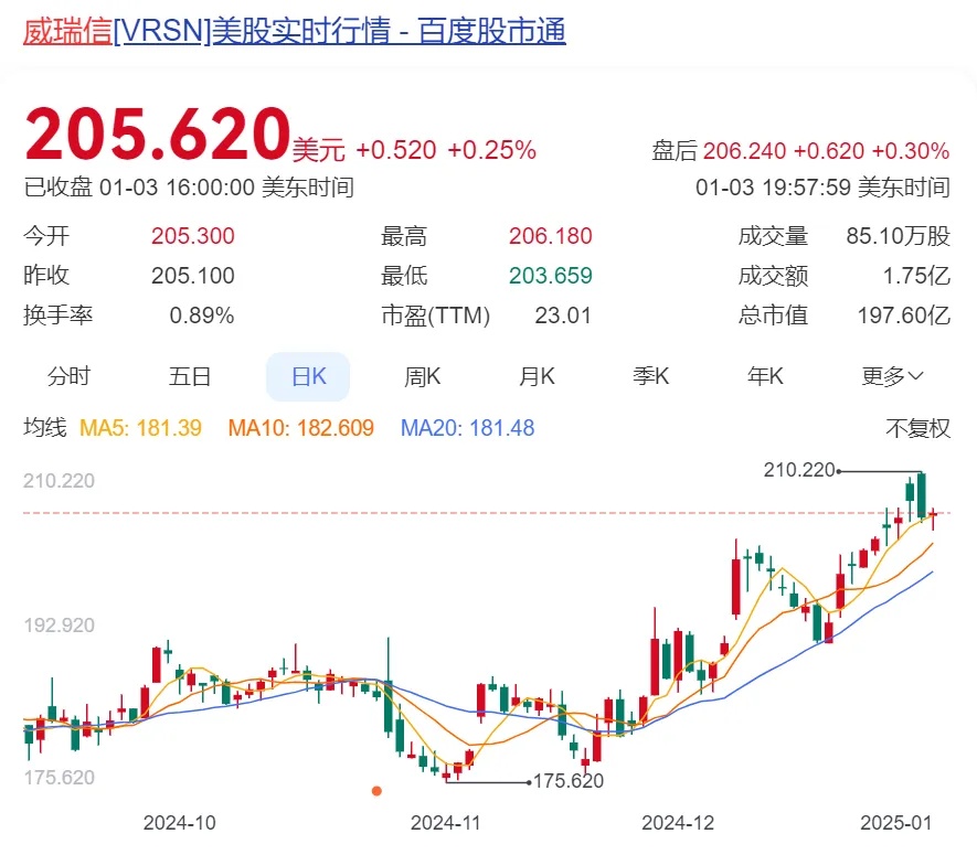 伯克希尔向美国证券交易委员会(SEC)最新提交的文件显示,其在2024年12月31日至2025年1月3日买入了约2万股威瑞信(VRSN.US)普通股,总金额约410万美元,约合人民币3000万元。