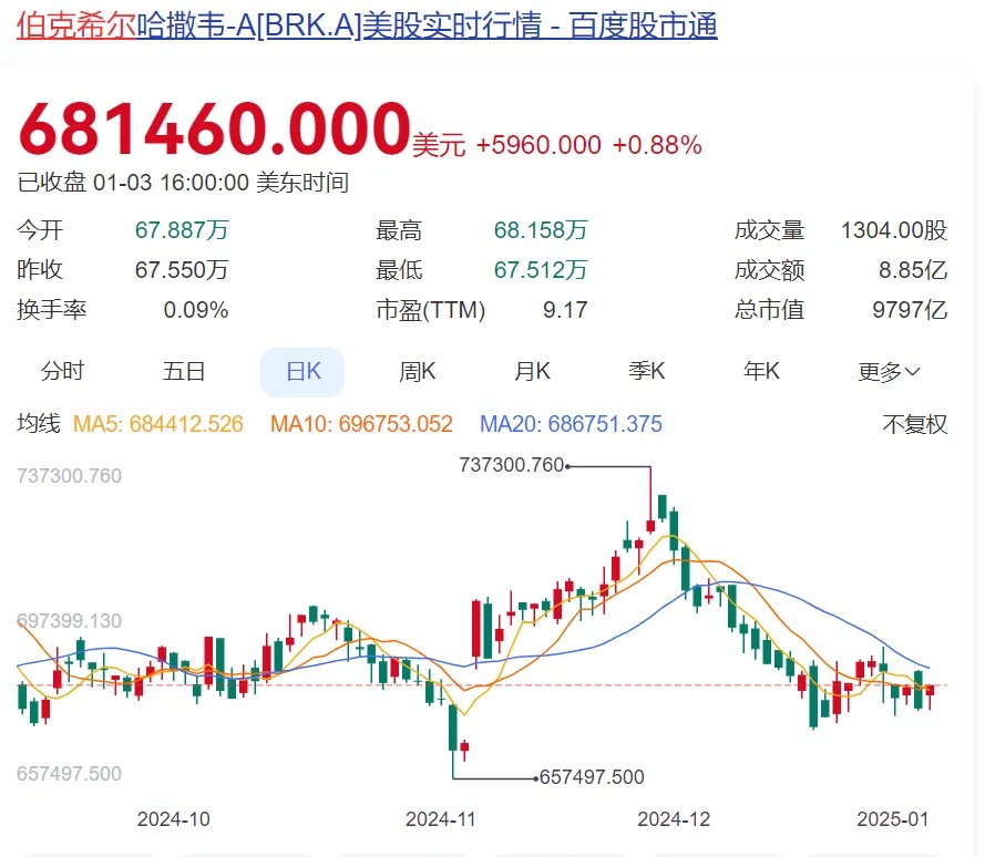 过去一个月,伯克希尔股价持续下跌,自11月末至今,市值蒸发超600亿美元(约合人民币4400亿元),跌破万亿美元。